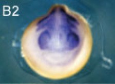 slc27a2 (solute carrier family 27 (fatty acid transporter), member 2) gene expression in Xenopus laevis embryo, assayed via in situ hybridization, NF stage 18, anterior view, dorsal up. This image is extracted from figure published in: Arima K et al. (2005), Image published in: Arima K et al. (2005) Copyright © 2005. Image reproduced with permission of the Publisher, John Wiley & Sons.