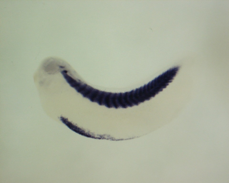 ank1 (ankyrin 1, erythrocytic) gene expression in Xenopus laevis embryo, assayed via in situ hybridization, NF stage 31, lateral view, anterior left, dorsal up. Copyright © Patient Lab