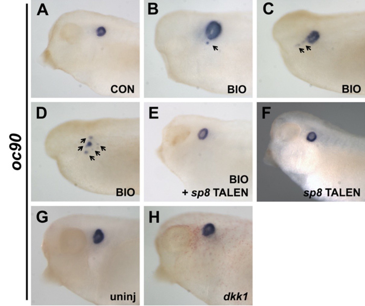 Fig. S9. Ectopic otic vesicle formation by activation of Wnt signaling is reduced when sp8 expression is down-regulated. Ectopic otic vesicle formation was evaluated by oc90 expression. Embryos incubated with 6-bromoindirubin-3′-oxime (BIO) from stage 13/14 to stage 28 were subject to in situ hybridization analysis. Whereas control embryos showed normal oc90 expression (A), BIO-treated embryos showed increased or ectopic oc90 expression (B–D). To address whether Wnt-induced ectopic otic vesicle formation requires sp8, embryos receiving sp8 ATGMO or sp8 TALEN injection at the two-cell stage were incubated with (E) or without (F) BIO from stage 13/14 to stage 28. Interestingly, BIO-induced ectopic otic vesicles were not observed in sp8 MO or TALEN injected embryos (E), indicating sp8 is required for the Wnt-mediated ectopic otic vesicle formation. Black arrows indicate ectopic oc90 expression. In addition, we observed that oc90 expression was retained on the dkk1-injected side (H) in comparision to the uninjected side (G), suggesting that the absence of sp8 expression in dkk1- injected embryos is not due to the loss of otic vesicle tissue. Image published in: Chung HA et al. (2014) Copyright © 2014. Image reproduced with permission of the Publisher and the copyright holder. This is an Open Access article distributed under the terms of the Creative Commons Attribution License. Larger Image Printer Friendly View |