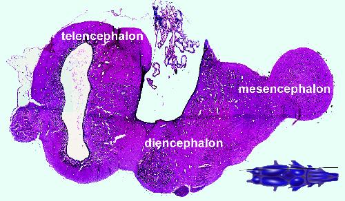 Definition: "Organ that is the center of the nervous system. It is located in the head, protected by the skull and close to the primary sensory apparatus of vision, hearing, balance, taste, and smell. It appears when the neural tube segregates in forebrain, midbrain, and hindbrain at NF stage 22. The general pattern of the brain has been mainly established at NF stage 28. Yolky material is consumed and the fibre tracts and later the commissures develop. In general all of its parts are well developed at NF stage 53 and later development consists mainly of growth and some further cytological differentiation. In the period of metamorphosis only topographical changes take place."