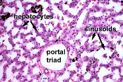 Definition: "Organ that secretes bile and participates in formation of certain blood proteins. The liver is the largest internal organ, primarily consisting of hepatocytes, and has a wider variety of functions than any other organs in the body. The hepatocyte is a polarized epithelial cell that exhibits both endocrine and exocrine properties. The biliary epithelial cells (cholangiocytes), sinusoidal endothelial cells, hepatic stellate cells (Ito cells), Kupffer cells, and pit cells (liver-specific natural killer cells) represent the majority of non-hepatocyte cell types in the liver. During embryogenesis, the liver is generated in the ventral foregut endoderm."