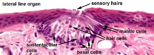 Definition: "Any of the sense organs that detect vibrations carried through water. They develop from a specialized series of dorsolateral ectodermal placodes named lateral line placodes."