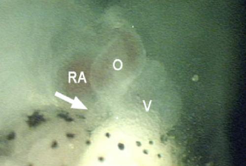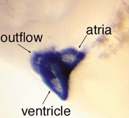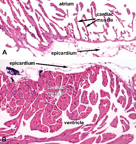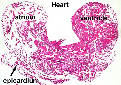 Definition: "A myogenic muscular organ found in the cardiovascular system. It is responsible for pumping blood throughout the blood vessels by repeated, rhythmic contractions. It is composed of cardiac muscle, which is an involuntary striated muscle tissue found only in this organ, and connective tissue. It is ultimately composed of three chambers (two atria and one ventricle), occupying a ventral position within the chest of the mature tadpole/frog."