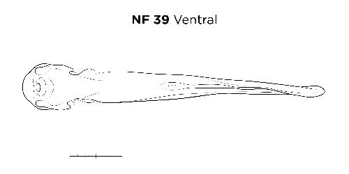 Definition: "Nieuwkoop and Faber stage 39, corresponding to an embryo of age 2 days, 8 hr 30 min at 22-24 Celsius and having the following external morphological criteria: Melanophores appearing around nasal pits. Opening of stomodeal invagination transversely elongated. Melanophores on back arranged in a superficial and a deeper layer. Outlines of proctodeum and tail myotomes forming angle of about 135 degrees. Melanophores appearing along ventral edge of tail musculature. Length: 5.9 - 6.5 mm."