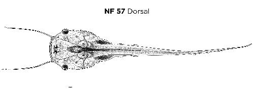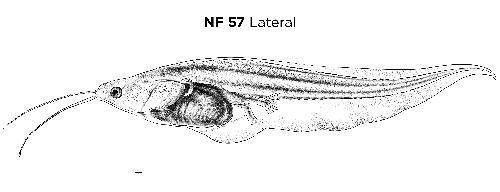 XAO ID: 1000069 Definition: "Nieuwkoop and Faber stage 57, corresponding to a tadpole of age about 41 days at 22-24 Celsius and having the following external morphological criteria: Pigment-free spot appearing above \"Stirnorgan\". Angle of elbow more than 90 degrees; fingers stretched out in forelimb atrium, their length about 7 times their breadth. Length: 75 - 105 mm." |
