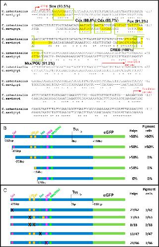 Dissection of a Ciona regulatory element reveals complexity of cross-species enhancer activity., Chen WC, Pauls S, Bacha J, Elgar G, Loose M, Shimeld SM., Dev Biol. June 15, 2014; 390 (2): 261-72. |