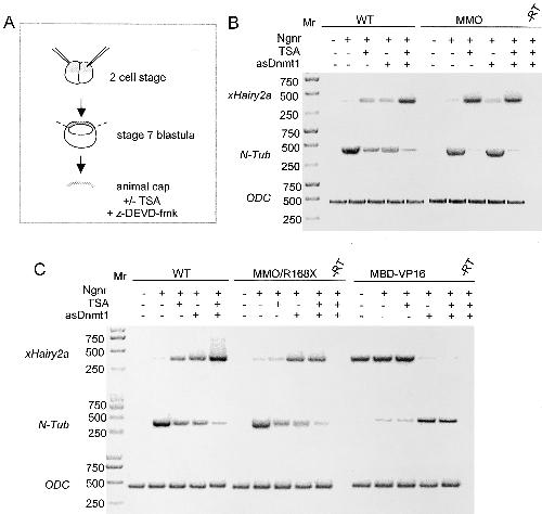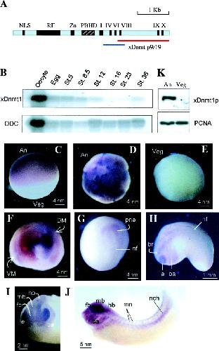 Loss of the maintenance methyltransferase, xDnmt1, induces apoptosis in Xenopus embryos., Stancheva I, Hensey C, Meehan RR., EMBO J. April 17, 2001; 20 (8): 1963-73.