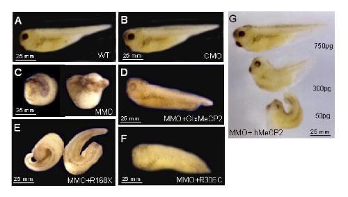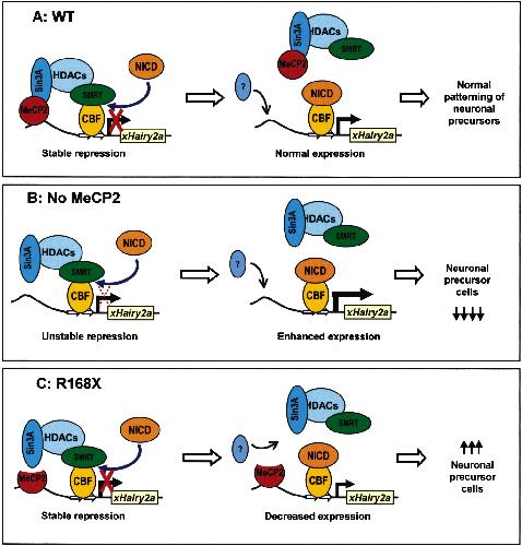 A mutant form of MeCP2 protein associated with human Rett syndrome cannot be displaced from methylated DNA by notch in Xenopus embryos., Stancheva I, Collins AL, Van den Veyver IB, Zoghbi H, Meehan RR., Mol Cell. August 1, 2003; 12 (2): 425-35.