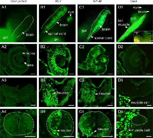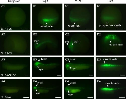 A method for using direct injection of plasmid DNA to study cis-regulatory element activity in F0 Xenopus embryos and tadpoles. , Wang C , Szaro BG ., Dev Biol. February 1, 2015; 398 (1): 11-23.