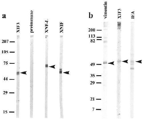 Xefiltin, a new low molecular weight neuronal intermediate filament protein of Xenopus laevis, shares sequence features with goldfish gefiltin and mammalian alpha-internexin and differs in expression from XNIF and NF-L. , Zhao Y, Szaro BG ., J Comp Neurol. January 20, 1997; 377 (3): 351-64.