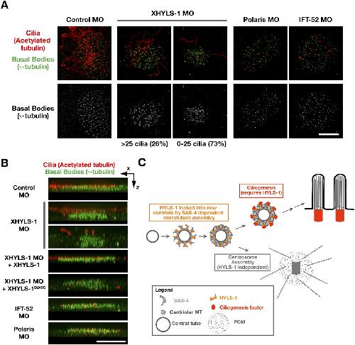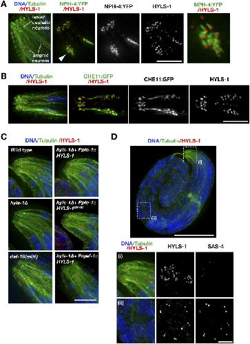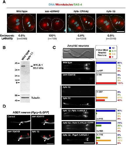 The hydrolethalus syndrome protein HYLS-1 links core centriole structure to cilia formation., Dammermann A, Pemble H, Mitchell BJ, McLeod I, Yates JR, Kintner C, Desai AB, Oegema K., Genes Dev. September 1, 2009; 23 (17): 2046-59. |