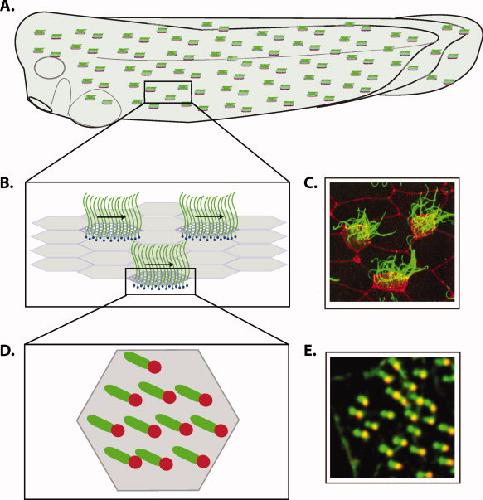 The PCP pathway instructs the planar orientation of ciliated cells in the Xenopus larval skin., Mitchell B, Stubbs JL, Huisman F, Taborek P, Yu C, Kintner C., Curr Biol. June 9, 2009; 19 (11): 924-9. |