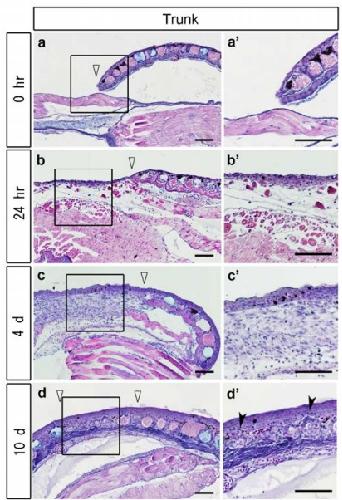 Insights regarding skin regeneration in non-amniote vertebrates: Skin regeneration without scar formation and potential step-up to a higher level of regeneration. , Abe G, Hayashi T, Yoshida K, Yoshida T, Kudoh H, Sakamoto J, Konishi A, Kamei Y, Takeuchi T, Tamura K , Yokoyama H ., Semin Cell Dev Biol. April 1, 2020; 100 109-121.