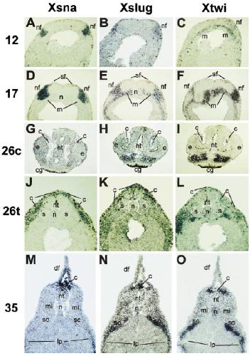 Relationship between gene expression domains of Xsnail, Xslug, and Xtwist and cell movement in the prospective neural crest of Xenopus. , Linker C, Bronner-Fraser M , Mayor R ., Dev Biol. August 15, 2000; 224 (2): 215-25.