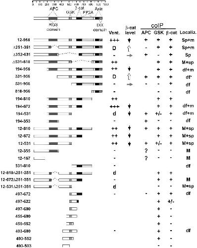 Domains of axin involved in protein-protein interactions, Wnt pathway inhibition, and intracellular localization. , Fagotto F , Jho Eh , Zeng L, Kurth T, Joos T, Kaufmann C, Costantini F., J Cell Biol. May 17, 1999; 145 (4): 741-56.