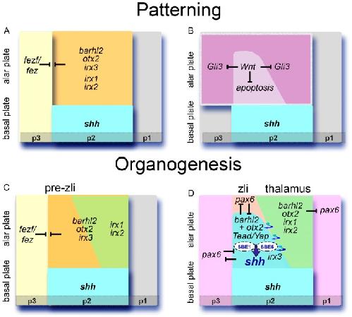 An Evolutionarily Conserved Network Mediates Development of the zona limitans intrathalamica, a Sonic Hedgehog-Secreting Caudal Forebrain Signaling Center. , Sena E, Feistel K , Durand BC ., J Dev Biol. October 20, 2016; 4 (4):