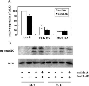 Notch signaling modulates the nuclear localization of carboxy-terminal-phosphorylated smad2 and controls the competence of ectodermal cells for activin A. , Abe T, Furue M, Kondow A , Matsuzaki K, Asashima M ., Mech Dev. May 1, 2005; 122 (5): 671-80.