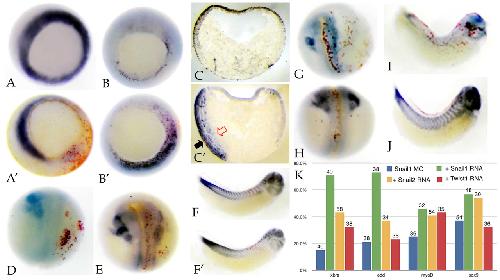 Unexpected functional redundancy between Twist and Slug ( Snail2) and their feedback regulation of NF-kappaB via Nodal and Cerberus. , Zhang C, Klymkowsky MW ., Dev Biol. July 15, 2009; 331 (2): 340-9.