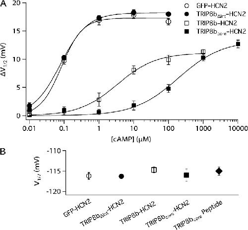 Binding of the auxiliary subunit TRIP8b to HCN channels shifts the mode of action of cAMP. , Hu L, Santoro B, Saponaro A, Liu H , Moroni A, Siegelbaum S., J Gen Physiol. December 1, 2013; 142 (6): 599-612.