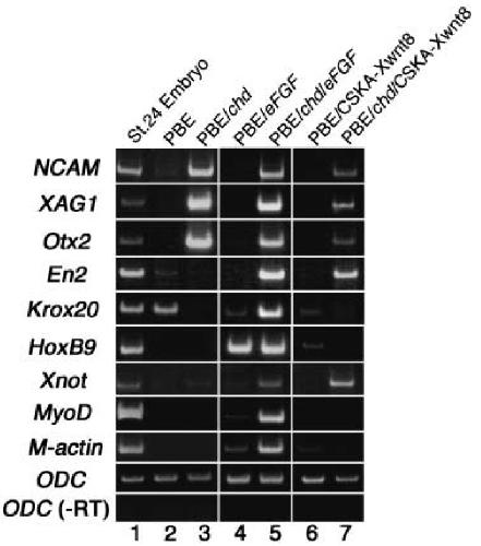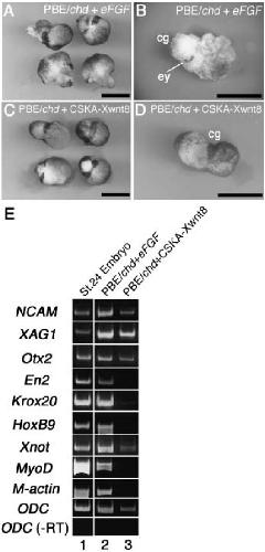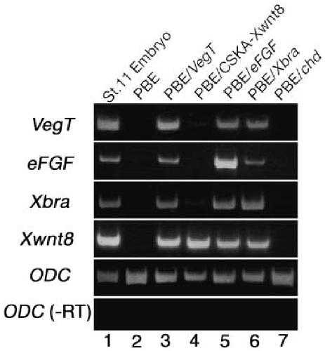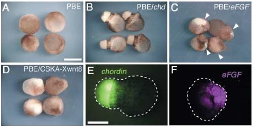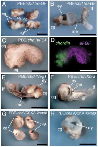 VegT, eFGF and Xbra cause overall posteriorization while Xwnt8 causes eye-level restricted posteriorization in synergy with chordin in early Xenopus development. , Fujii H, Sakai M, Nishimatsu S, Nohno T, Mochii M , Orii H, Watanabe K ., Dev Growth Differ. March 1, 2008; 50 (3): 169-80.