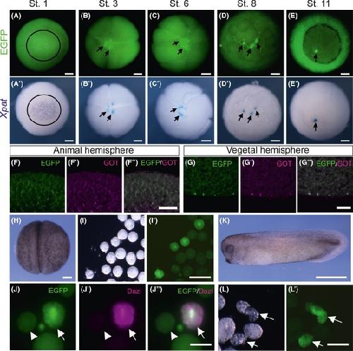 Visualization of the Xenopus primordial germ cells using a green fluorescent protein controlled by cis elements of the 3' untranslated region of the DEADSouth gene. , Kataoka K, Yamaguchi T, Orii H, Tazaki A , Watanabe K , Mochii M ., Mech Dev. October 1, 2006; 123 (10): 746-60.