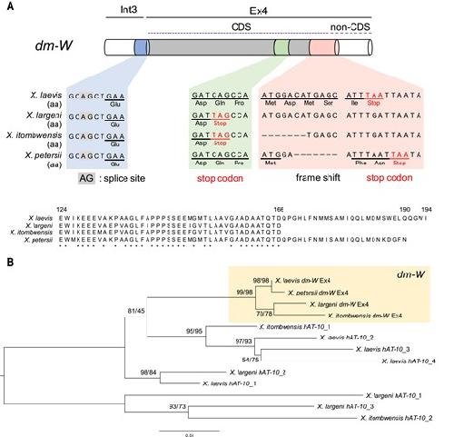 Neofunctionalization of a Noncoding Portion of a DNA Transposon in the Coding Region of the Chimerical Sex-Determining Gene dm-W in Xenopus Frogs. , Hayashi S, Suda K, Fujimura F, Fujikawa M, Tamura K , Tsukamoto D, Evans BJ , Takamatsu N, Ito M., Mol Biol Evol. July 2, 2022; 39 (7):