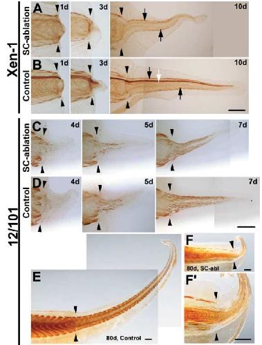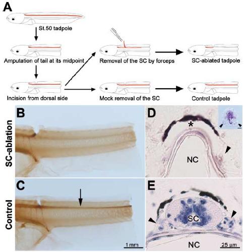Spinal cord is required for proper regeneration of the tail in Xenopus tadpoles. , Taniguchi Y, Sugiura T, Tazaki A , Watanabe K , Mochii M ., Dev Growth Differ. February 1, 2008; 50 (2): 109-20.