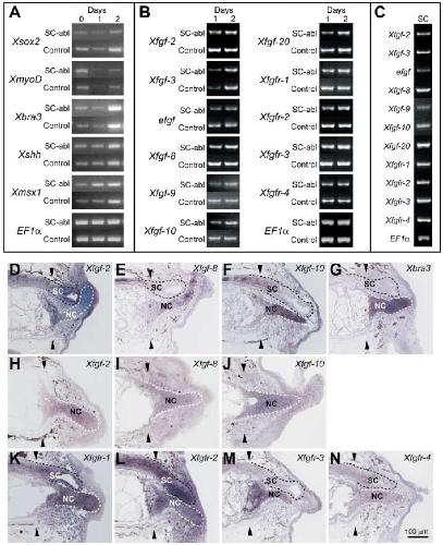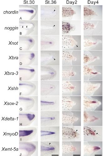 Differential gene expression between the embryonic tail bud and regenerating larval tail in Xenopus laevis. , Sugiura T, Taniguchi Y, Tazaki A , Ueno N , Watanabe K , Mochii M ., Dev Growth Differ. February 1, 2004; 46 (1): 97-105.