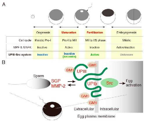 The egg membrane microdomain-associated uroplakin III-Src system becomes functional during oocyte maturation and is required for bidirectional gamete signaling at fertilization in Xenopus laevis., Mahbub Hasan AK, Hashimoto A, Maekawa Y, Matsumoto T, Kushima S, Ijiri TW, Fukami Y, Sato K., Development. April 1, 2014; 141 (8): 1705-14. |