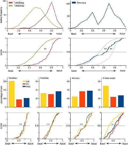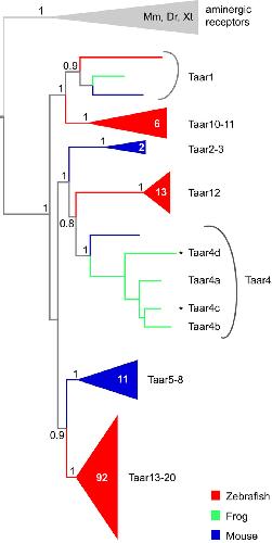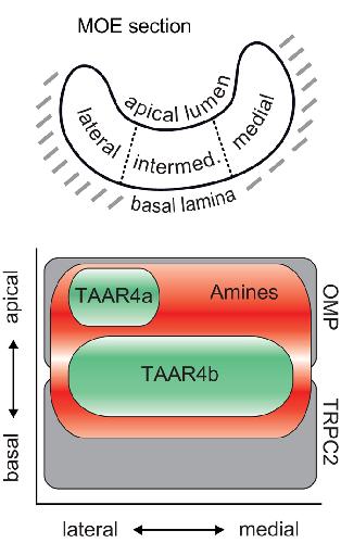 Different expression domains for two closely related amphibian TAARs generate a bimodal distribution similar to neuronal responses to amine odors. , Syed AS, Sansone A, Röner S, Bozorg Nia S, Manzini I , Korsching SI., Sci Rep. January 12, 2015; 5 13935.