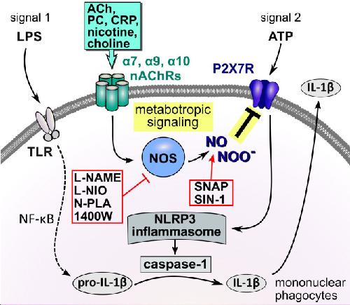 Activation of endothelial NO synthase and P2X7 receptor modification mediates the cholinergic control of ATP-induced interleukin-1β release by mononuclear phagocytes. , Richter K , Asci N, Singh VK, Yakoob SH, Meixner M, Zakrzewicz A, Liese J, Hecker A, Wilker S, Stumpf S, Schlüter KD, Rohde M, Gödecke A, Padberg W, Manzini I , Schmalzing G, Grau V., Front Immunol. January 1, 2023; 14 1140592.