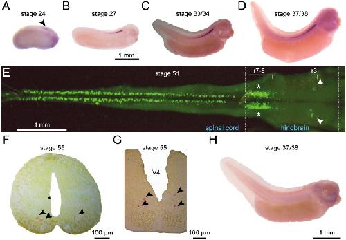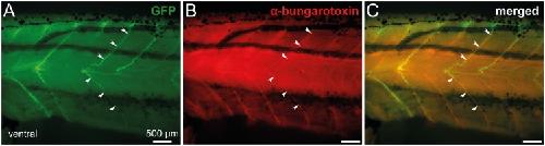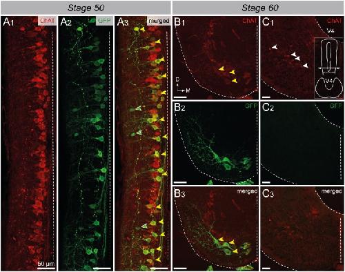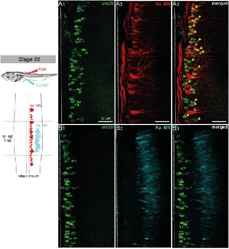 Generation of BAC transgenic tadpoles enabling live imaging of motoneurons by using the urotensin II-related peptide (ust2b) gene as a driver., Bougerol M, Auradé F, Lambert FM, Le Ray D, Combes D, Thoby-Brisson M, Relaix F, Pollet N, Tostivint H., PLoS One. February 6, 2015; 10 (2): e0117370.