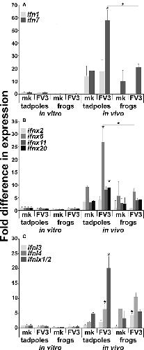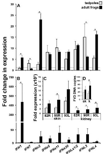 Prominent amphibian (Xenopus laevis) tadpole type III interferon response to the frog virus 3 ranavirus. , Grayfer L , De Jesús Andino F, Robert J ., J Virol. May 1, 2015; 89 (9): 5072-82.