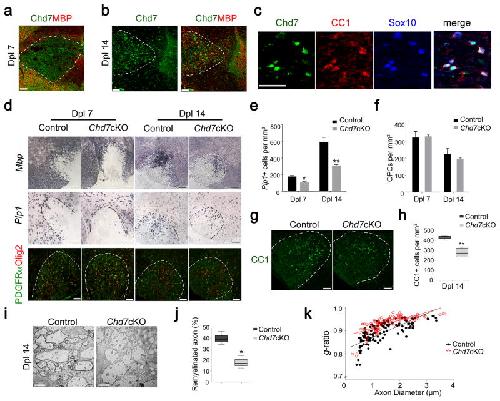 Chd7 cooperates with Sox10 and regulates the onset of CNS myelination and remyelination., He D, Marie C, Zhao C, Kim B, Wang J, Deng Y, Clavairoly A, Frah M, Wang H, He X, Hmidan H, Jones BV, Witte D, Zalc B, Zhou X, Choo DI, Martin DM, Parras C, Lu QR., Nat Neurosci. May 1, 2016; 19 (5): 678-89. |