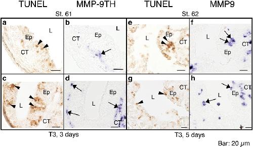 Expression profiles of the duplicated matrix metalloproteinase-9 genes suggest their different roles in apoptosis of larval intestinal epithelial cells during Xenopus laevis metamorphosis. , Hasebe T , Kajita M, Fujimoto K , Yaoita Y , Ishizuya-Oka A ., Dev Dyn. August 1, 2007; 236 (8): 2338-45.
