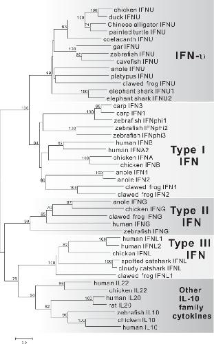 Identification and establishment of type IV interferon and the characterization of interferon-υ including its class II cytokine receptors IFN-υR1 and IL-10R2. , Chen SN, Gan Z, Hou J, Yang YC , Huang L, Huang B, Wang S, Nie P., Nat Commun. 13 (1): 999.