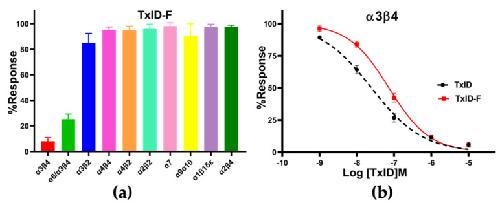 Fluorescently Labeled α-Conotoxin TxID, a New Probe for α3β4 Neuronal Nicotinic Acetylcholine Receptors. , Huang M, Zhu X, Yang Y , Tan Y, Luo S, Zhangsun D., Mar Drugs. August 12, 2022; 20 (8):