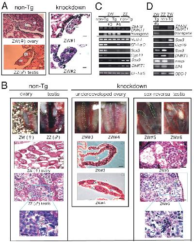 Opposite roles of DMRT1 and its W-linked paralogue, DM-W, in sexual dimorphism of Xenopus laevis: implications of a ZZ/ZW-type sex-determining system. , Yoshimoto S, Ikeda N, Izutsu Y , Shiba T, Takamatsu N, Ito M., Development. August 1, 2010; 137 (15): 2519-26.