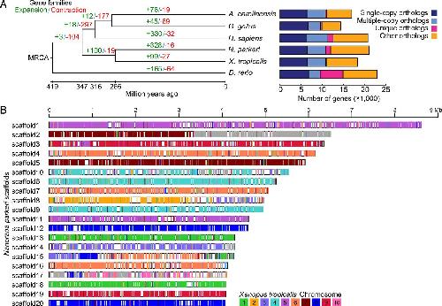 Whole-genome sequence of the Tibetan frog Nanorana parkeri and the comparative evolution of tetrapod genomes., Sun YB, Xiong ZJ, Xiang XY, Liu SP, Zhou WW, Tu XL, Zhong L, Wang L, Wu DD, Zhang BL, Zhu CL, Yang MM, Chen HM, Li F, Zhou L, Feng SH, Huang C, Zhang GJ, Irwin D, Hillis DM, Murphy RW, Yang HM, Che J, Wang J, Zhang YP., Proc Natl Acad Sci U S A. March 17, 2015; 112 (11): E1257-62. |
