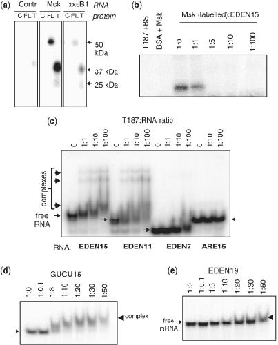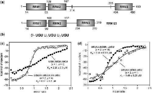 Sequence determinants for the tandem recognition of UGU and CUG rich RNA elements by the two N--terminal RRMs of CELF1. , Edwards J, Malaurie E, Kondrashov A, Long J, de Moor CH , Searle MS, Emsley J., Nucleic Acids Res. October 1, 2011; 39 (19): 8638-50.