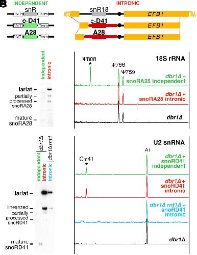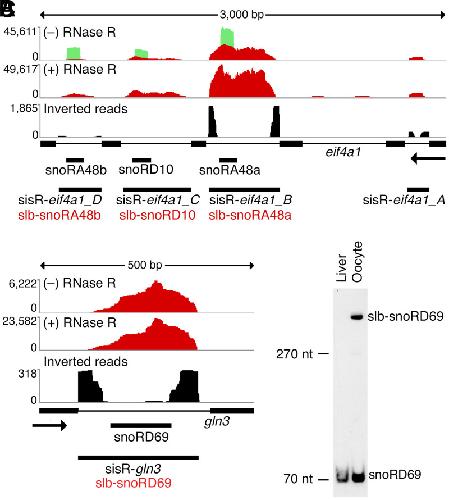 Stable lariats bearing a snoRNA (slb-snoRNA) in eukaryotic cells: A level of regulation for guide RNAs., Talross GJS, Deryusheva S, Gall JG., Proc Natl Acad Sci U S A. November 9, 2021; 118 (45):