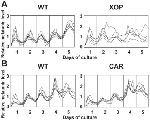 In vivo disruption of Xenopus CLOCK in the retinal photoreceptor cells abolishes circadian melatonin rhythmicity without affecting its production levels. , Hayasaka N, LaRue SI, Green CB ., J Neurosci. March 1, 2002; 22 (5): 1600-7.