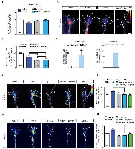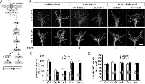 Asymmetrical beta-actin mRNA translation in growth cones mediates attractive turning to netrin-1., Leung KM, van Horck FP, Lin AC, Allison R, Standart N, Holt CE., Nat Neurosci. October 1, 2006; 9 (10): 1247-56. |