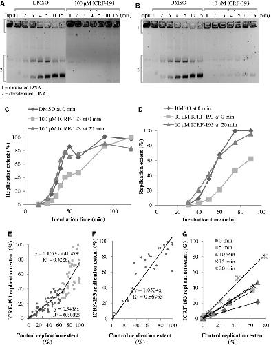 Replication-fork stalling and processing at a single psoralen interstrand crosslink in Xenopus egg extracts. , Le Breton C, Hennion M, Arimondo PB, Hyrien O ., PLoS One. April 15, 2011; 6 (4): e18554.