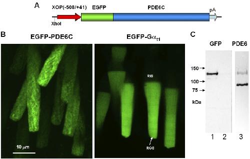 Regulation of rhodopsin-eGFP distribution in transgenic xenopus rod outer segments by light., Haeri M, Calvert PD, Solessio E, Pugh EN, Knox BE., PLoS One. January 1, 2013; 8 (11): e80059.