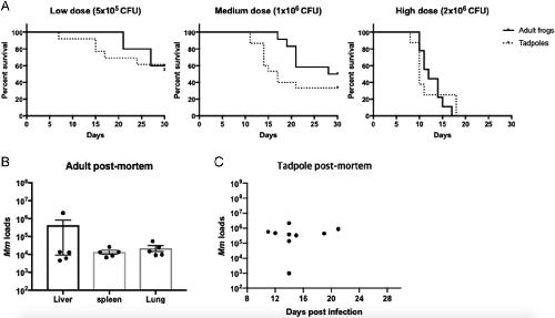 Distinct Host-Mycobacterial Pathogen Interactions between Resistant Adult and Tolerant Tadpole Life Stages of Xenopus laevis. , Rhoo KH, Edholm ES, Forzán MJ, Khan A, Waddle AW, Pavelka MS, Robert J ., J Immunol. November 15, 2019; 203 (10): 2679-2688.