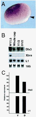 Inhibitory patterning of the anterior neural plate in Xenopus by homeodomain factors Dlx3 and Msx1. , Feledy JA, Beanan MJ, Sandoval JJ, Goodrich JS, Lim JH, Matsuo-Takasaki M, Sato SM , Sargent TD ., Dev Biol. August 15, 1999; 212 (2): 455-64.