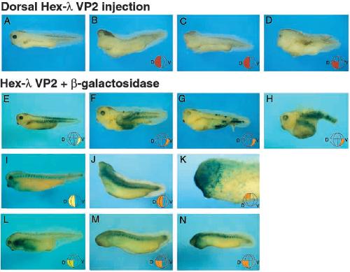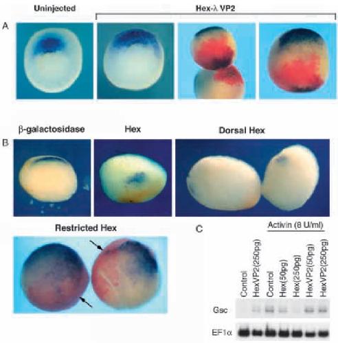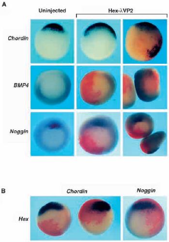 Hex is a transcriptional repressor that contributes to anterior identity and suppresses Spemann organiser function., Brickman JM, Jones CM, Clements M, Smith JC, Beddington RS., Development. June 1, 2000; 127 (11): 2303-15. |