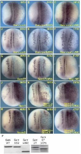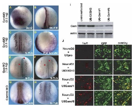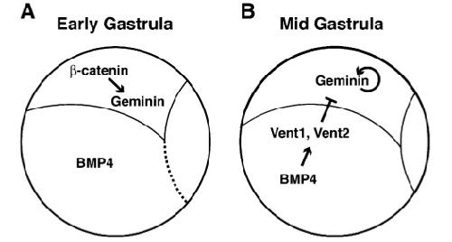 Geminin, a neuralizing molecule that demarcates the future neural plate at the onset of gastrulation. , Kroll KL , Salic AN, Evans LM, Kirschner MW ., Development. August 1, 1998; 125 (16): 3247-58.