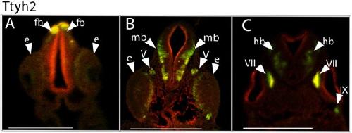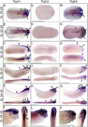 Characterization of tweety gene ( ttyh1-3) expression in Xenopus laevis during embryonic development. , Halleran AD, Sehdev M, Rabe BA, Huyck RW , Williams CC, Saha MS ., Gene Expr Patterns. January 1, 2015; 17 (1): 38-44.